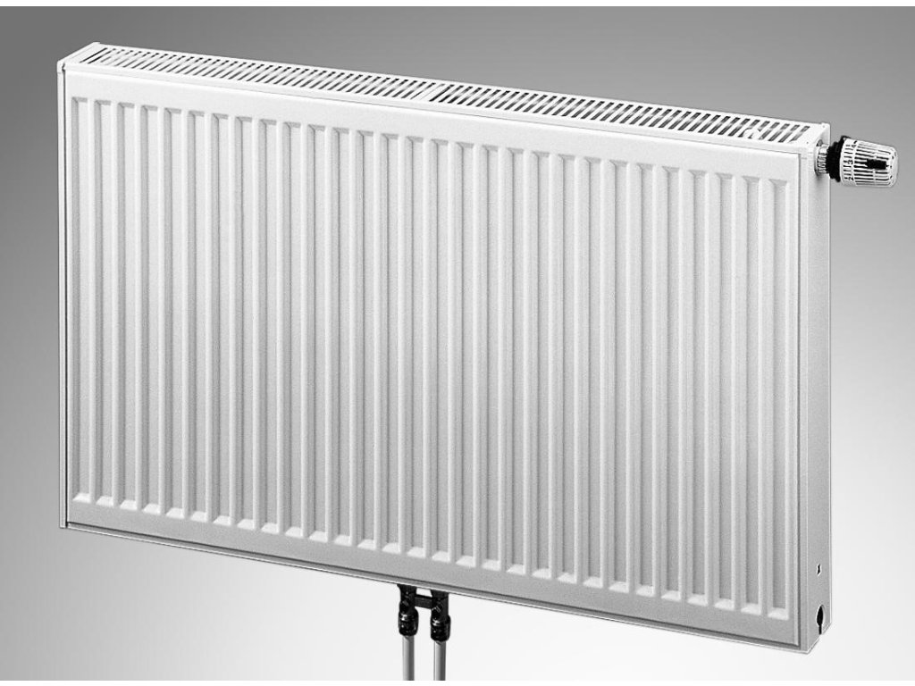 Typ VKM 22 - středové připojení - dvoudeskový radiátor se dvěma vnitřními konvektory a spodním přípojením.