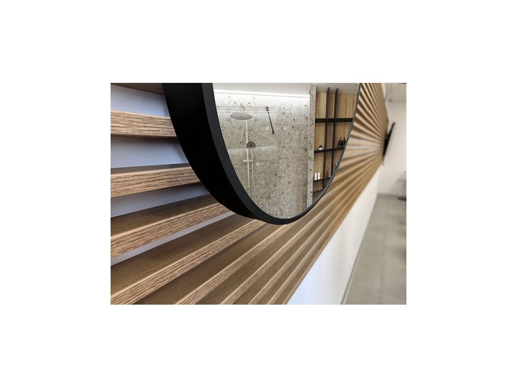 Jednoduché kulaté zrcadlo Emilia s designovým černým rámem. Zrcadlo je vybaveno úchyty (závěsy i vhodné háčky na zeď) pro zavěšení.