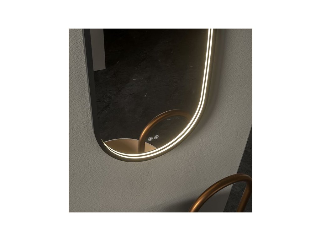 Originální oválné zrcadlo Emilia s LED osvětlením a černým rámem. Osvětlení zrcadla se spouští dotykovým senzorem umístěným ve spodní přední části zrcadla.