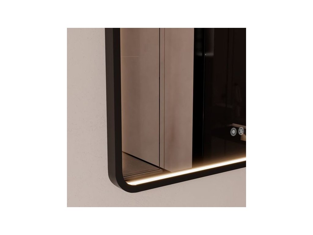 Působivé obdélníkové zrcadlo Emilia s LED osvětlením a černým rámem se zaoblenými rohy. Osvětlení zrcadla se spouští dotykovým senzorem umístěným ve spodní přední části zrcadla.