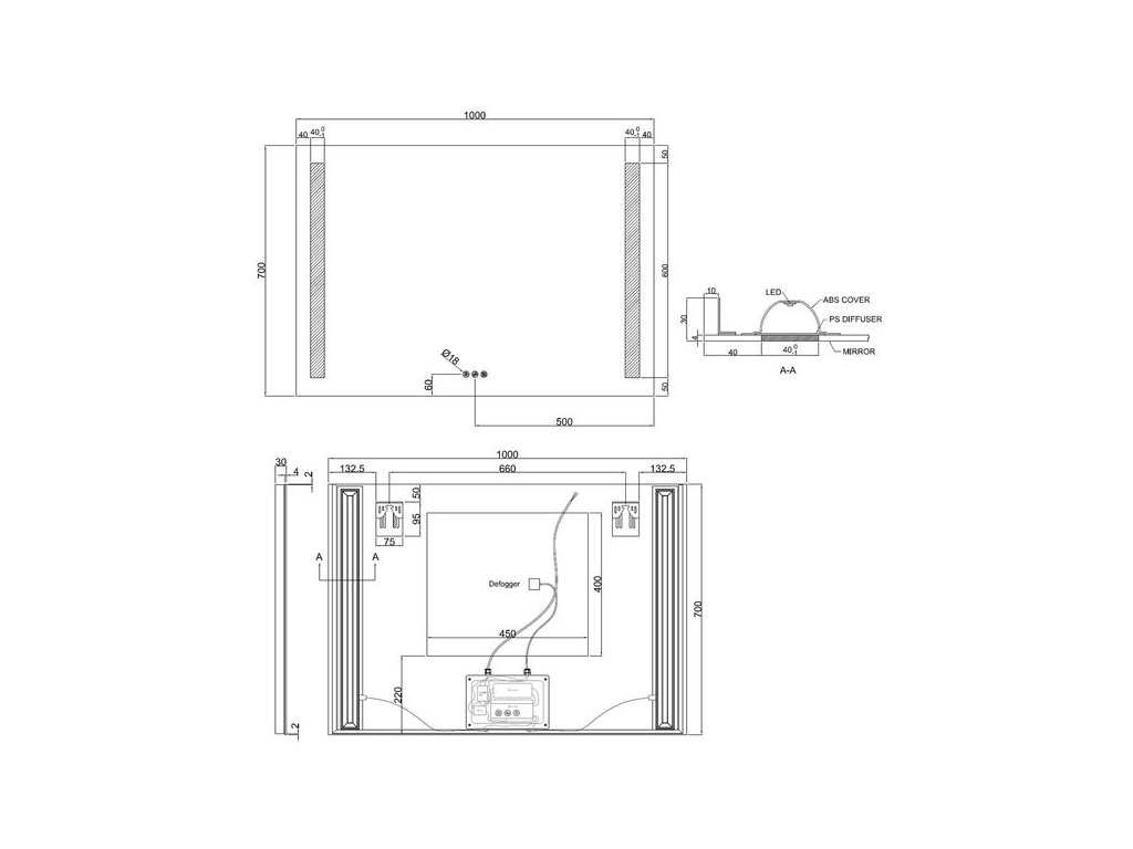 - dvě vertikální LED pásky 600 x 40 mm