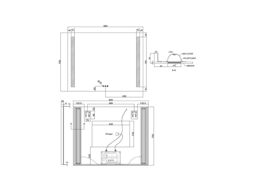 - dvě vertikální LED pásky 600 x 40 mm
