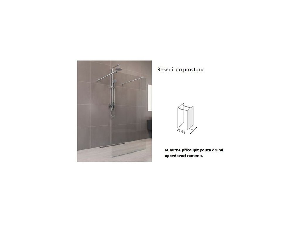 - 1x upevňovací rameno - druhé upevňovací rameno je nutné dokoupit zvlášť (Další nastavitelné upevňovací rameno do 120 cm je nutné dokoupit pouze při umístění Walk-in stěny do prostoru, kdy dvě ramena drží sklo souběžně se stěnou a vstup je možný z obou stran.)