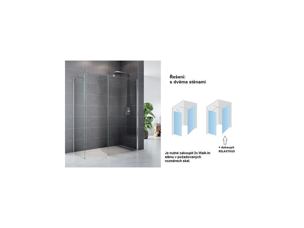 - 2x Walk-In Relax sprchovou stěnu z této série v požadovaných šířkách (např. 80 cm a 100 cm) - vzpěry jsou součástí.