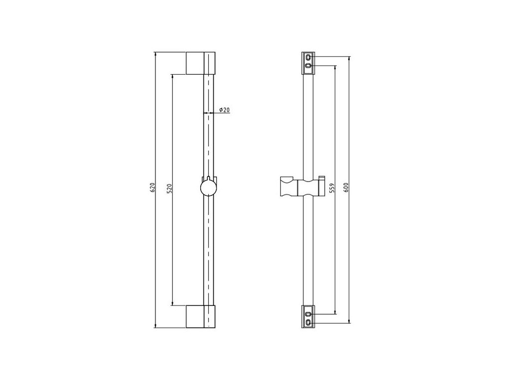 - kovová tyč s posuvným držákem sprchy, délka 600 mm, ø 20 mm, koncovky a pojezd jsou plastové