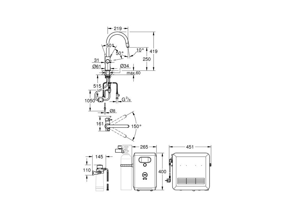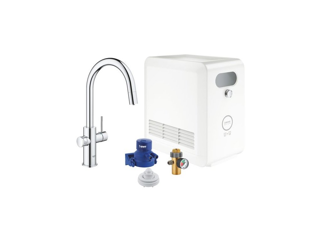 - Grohe Blue filtr, CO2 karbonizační lahev a čisticí kazeta nejsou součástí balení a musí být objednány samostatně