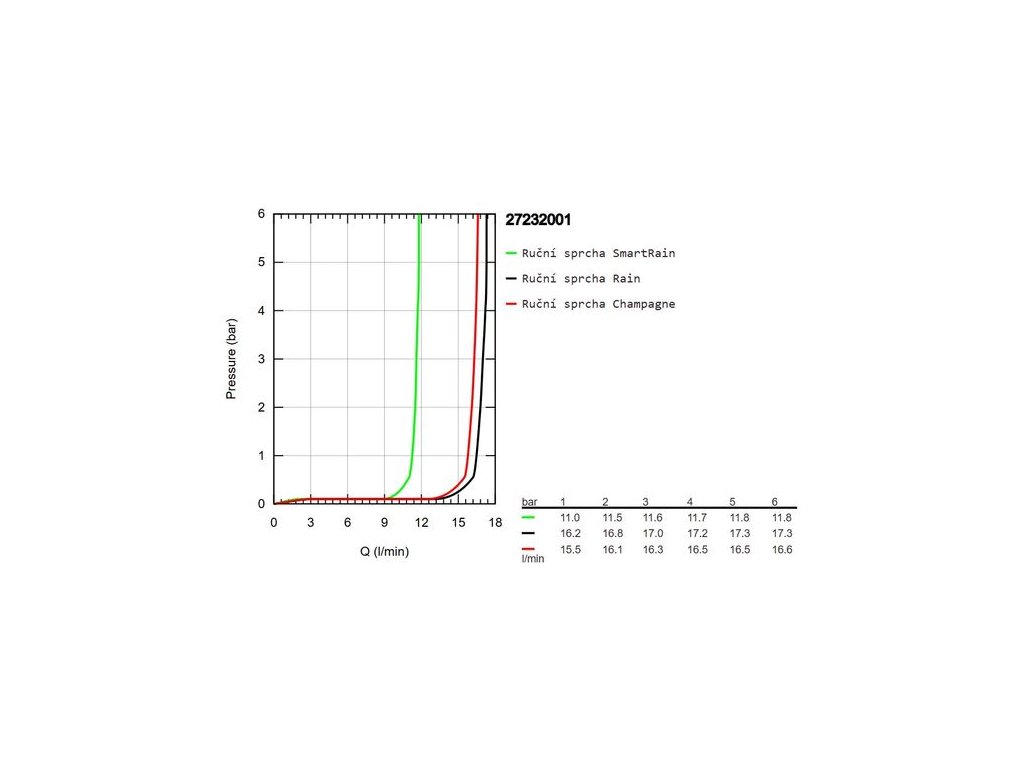 - průtok při 0,3 MPa: SmartRain: 11,6 l/min, Champagne: 16,3 l/min, Rain: 17 l/min