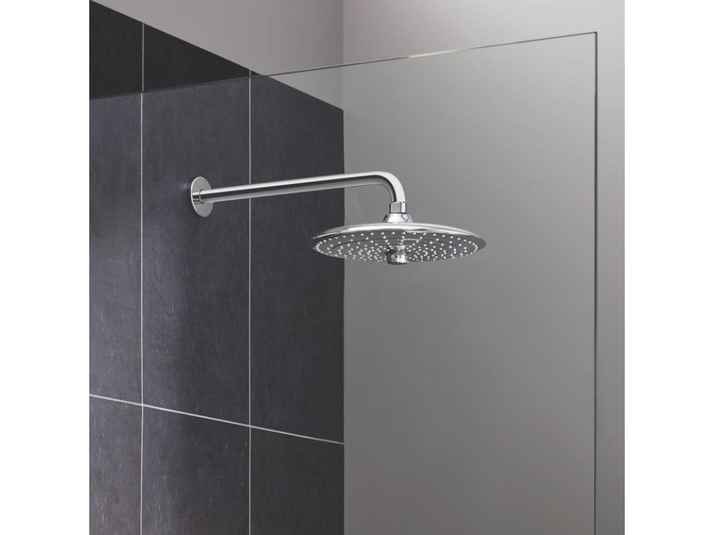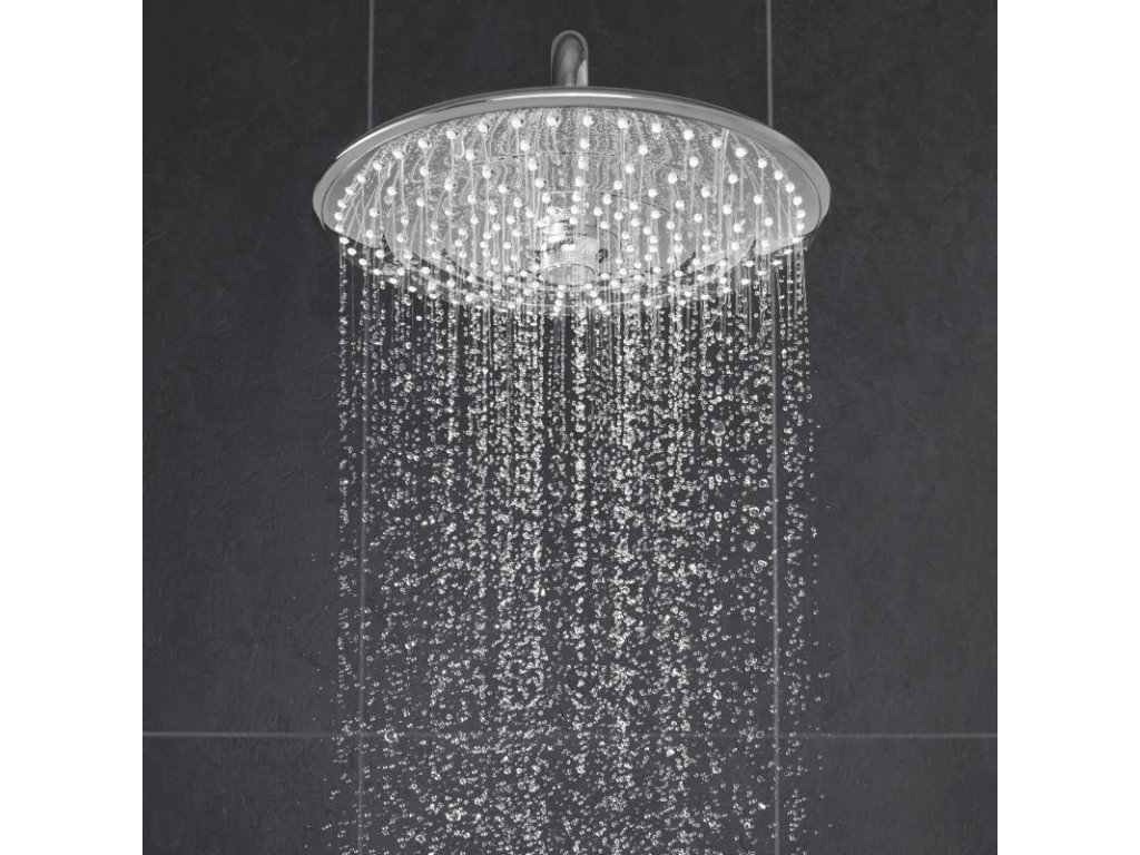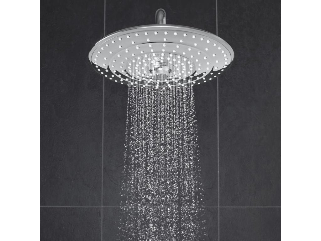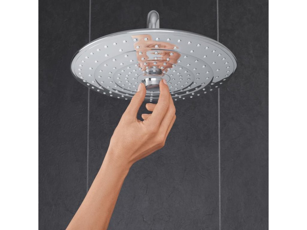 Režim proudu SmartRain je širší a jemnější, zatímco slavný režim Rain využívá všech trysek sprchové hlavice pro pokrytí celého těla – a sprchu, která vás dokonale uvolní a rozveselí. Přitom vše, co potřebujete ke změně režimu proudu, je otočit inovativním kolečkem uprostřed impozantní, 260mm sprchové hlavice. Velmi prosté. Díky svému štíhlému profilu a nadčasovému designu sprcha skvěle zapadne do koupelen různých stylů, zatímco je uvnitř plná sofistikovaných technologií GROHE. Omezovač průtoku GROHE EcoJoy snižuje spotřebu vody na 9,5 l/min a zaručuje přitom maximální požitek ze sprchy.