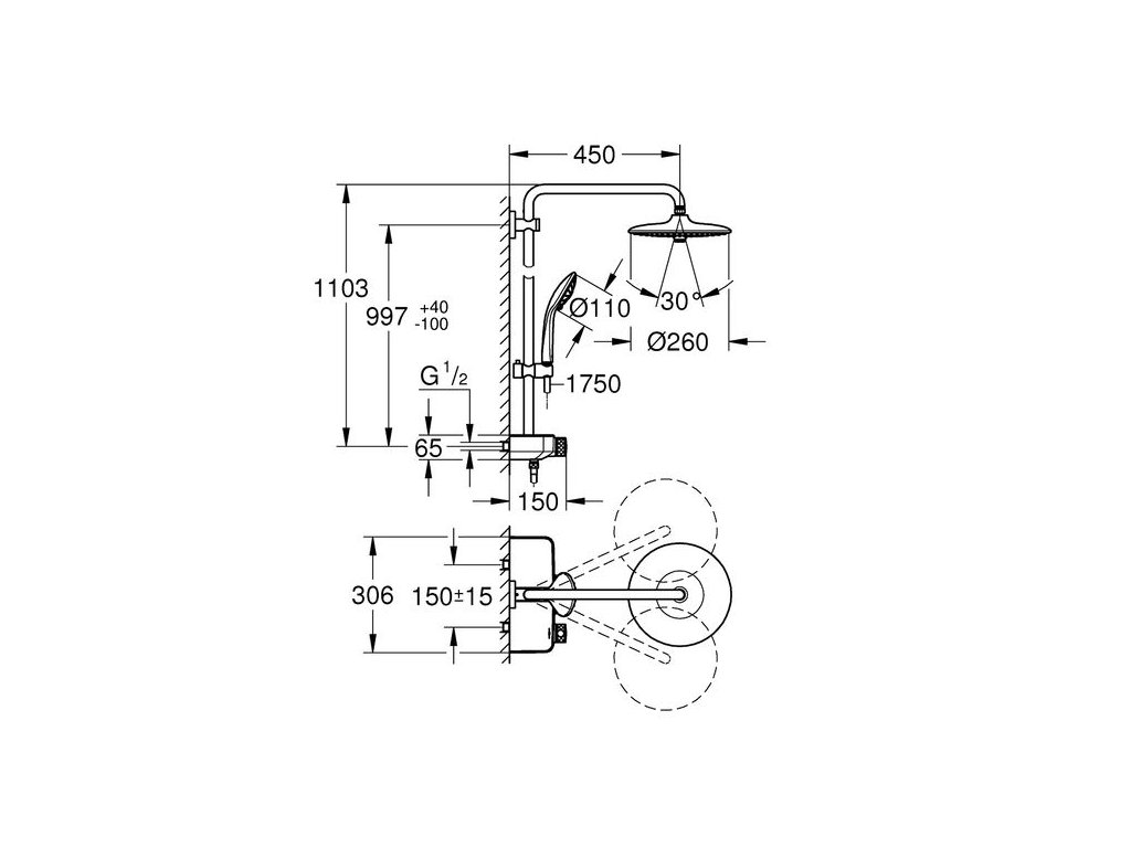 Sprchový systém 260 Mono s termostatickou tlačítkovou baterií na zeď.