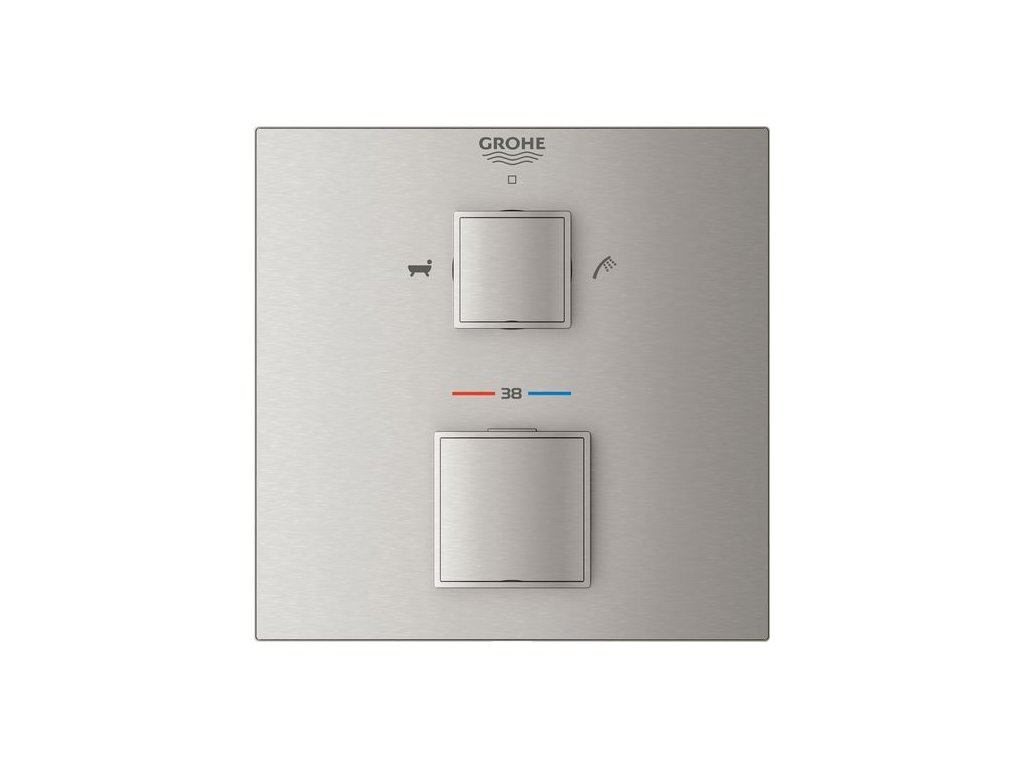 Termostatická sprchová baterie Grohtherm Cube poslouží jako dokonalý finální prvek vaší nové vany. Umožňuje snadné přepínání mezi sprchou a vanovou výpustí. Průtok je možné snadno regulovat díky technologii GROHE AquaDimmer, která vám dovolí současně nasměrovat vodu tam, kam chcete, a nastavit objem tekoucí vody. Její atraktivní, čtvercový design, který se dokonale hodí k bateriím GROHE Eurocube, vás bude vybízet k interakci prostřednictvím intuitivních ovládacích prvků, zatímco štíhlá konstrukce (tloušťka nástěnného panelu pouhých 10 mm, celkový přesah 43 mm) z baterie činí ideální doplněk minimalistických prostorů. Tato termostatická baterie se vyrábí v Německu a je plná inovativních technologií. Technologie GROHE TurboStat zabraňuje nepříjemným teplotním výkyvům. Obavy z popálení se stanou minulostí díky tlačítkové pojistce GROHE SafeStop, která zabraňuje nechtěnému nastavení teploty vyšší než 38 °C. Volitelná pojistka GROHE SafeStop Plus poté slouží jako přídavná úroveň zabezpečení na teplotní hranici 43 °C. Elegantní a odolná povrchová úprava GROHE StarLight je vyrobena metodou fyzikální depozice z plynné fáze (PVD), která je mimořádně odolná proti poškrábání a udrží si svůj nádherný vzhled po celou dobu životnosti. Systém GROHE QuickFix s patentovaným uzamykacím mechanismem a krytými šrouby s těsněním činí instalaci rychlou a jednoduchou. Mějte prosím na paměti, že tuto baterii je možné zapojit pouze v kombinaci s podomítkovým tělesem GROHE Rapido SmartBox (35600000). A můžete se spolehnout: Toto kombinované řešení pro podomítkovou instalaci je 100% utěsněno a zabezpečeno proti úniku vody.