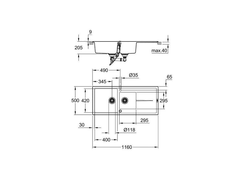 Tento oboustranný, 1,5 sektorový, svrchně montovaný dřez s odkapávačem (116 cm × 50 cm) je vyrobený ze speciálního kompozitního materiálu, jehož složení je 80 % křemenná žula a 20 % akrylová pryskyřice s pojivými látkami. Díky tomu je dřez odolný vůči poškrábání, teplu a mechanickému poškození.