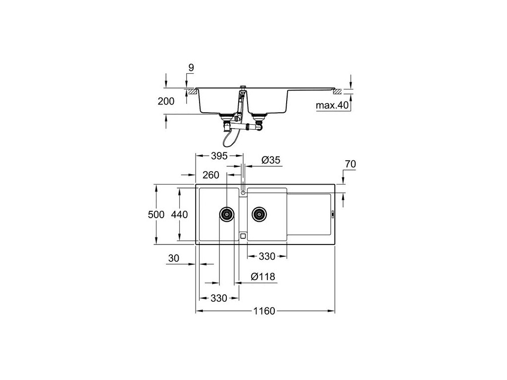 Velikost sektoru dřezu 330 x 440 x 200 mm