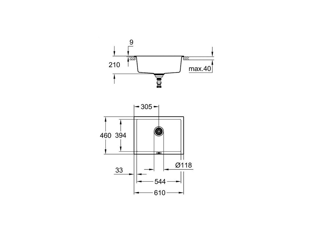 Hloubka vnitřní vaničky je 20 cm. Jedinečný proces výroby dodává těmto dřezům bezchybný povrch umožňující snadnou údržbu a zaručující 100% bezpečnost při kontaktu s potravinami. Kromě toho elegantní, moderní povrch z černé žuly nereaguje na UV paprsky, takže si zachová svůj elegantní vzhled po celou dobu životnosti. Technologie GROHE Whisper značně potlačuje hluk vody odtékající z dřezu. Systém GROHE QuickFix umožňuje rychlou a přímou instalaci.