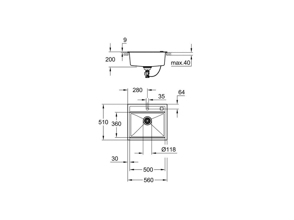 Velikost sektoru dřezu 500 x 360 x 200 mm
