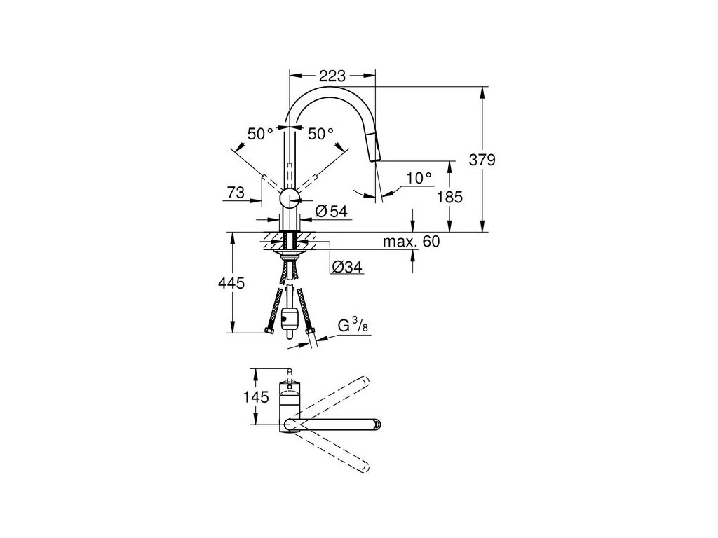 Pro absolutní flexibilitu je součástí baterie také vytahovací sprchová hlavice se dvěma režimy proudu, jemnou sprškou a výkonnou tryskou, kterou oceníte zejména u plnění vysokých hrnců a nádob nebo při čištění dřezu. Technologie GROHE EasyDock znamená, že se sprchová hlavice automaticky zasune zpět do výpusti, jakmile ji přestanete používat. A silikonové trysky SpeedClean umožňují veškeré usazeniny vodního kamene setřít jednoduše prstem.