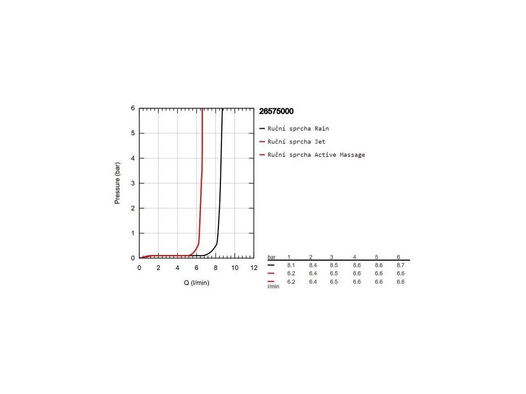 - průtok při 0,3 MPa: Jet: 6,5 l/min, Active Massage: 6,5 l/min, Rain: 8,5 l/min