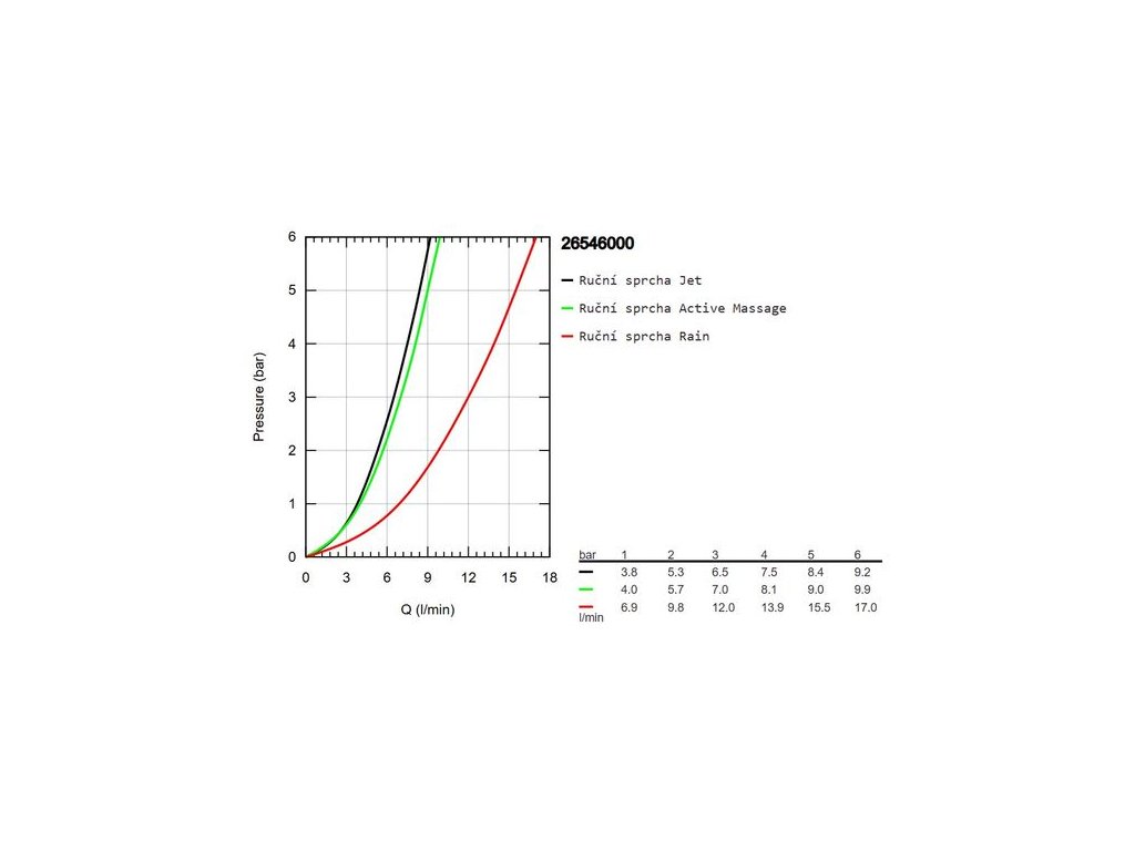 - průtok při 0,3 MPa: Jet: 6,5 l/min, Active Massage: 7 l/min, Rain: 12 l/min