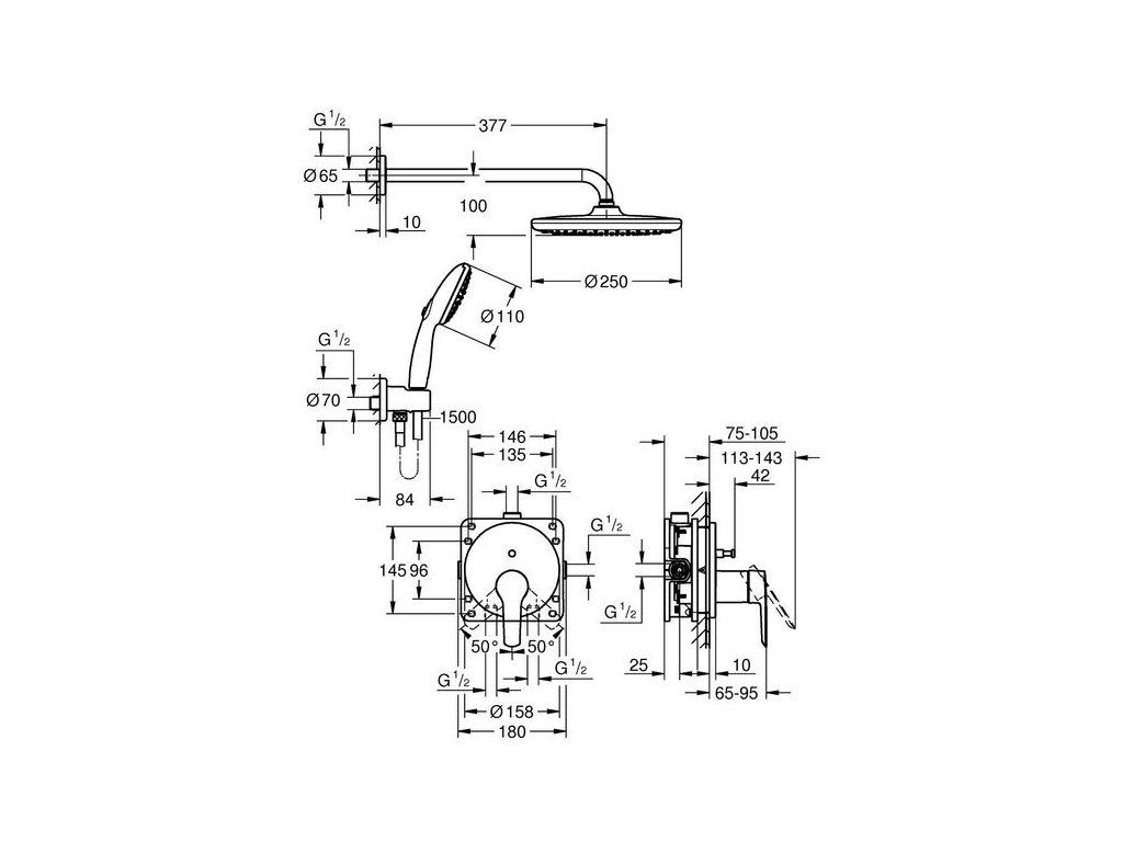 Podomítkový sprchový systém GROHE Start, který má vše, co potřebujete pro dokonalý zážitek ze sprchování v jednom kompletním balení, dodává vaší koupelně elegantní styl a chytré funkce! Tenký jednopákový kryt Start s 2cestným přepínačem – spárovaný s univerzálním hrubým boxem Rapido SmartBox pro skrytou instalaci – má moderní vzhled. Díky odolné keramické kartuši GROHE SilkMove si můžete užívat sametově hladké ovládání objemu a teploty vody pomocí pevné kovové páky. A německá technologie zaručuje skvělý výkon při sprchování: 250mm hlavová sprcha, která má 380mm rameno, dodává náš uklidňující déšť, ale nezapomeňte na 110mm ruční sprchu. Má dva skvělé vzory proudu prostřednictvím inovativního přepínače GROHE SmartSwitch – cílený proudový sprej, který je ideální pro mytí vlasů, a relaxační sprej Rain, který je jemný jako letní déšť. Ruční sprcha má silikonový kroužek ShockProof, který chrání před poškozením při pádu. Dodává se s držákem se sprchovým výstupem a 1500mm hadicí VitalioFlex Comfort s designem TwistStop. Technologie GROHE DreamSpray zajišťuje rovnoměrný proud z každé silikonové trysky SpeedClean, kterou lze vyčistit pouhým kartáčkem prstu. Odolná povrchová úprava GROHE Long-Life se snadno čistí a zachová úchvatný vzhled sady po celý život. A dobrou zprávou je, že instalace obložení je rychlá a snadná díky GROHE FastFixation, která má uzamykací systém, kryté kování a těsnění hřídele. To znamená, že nehrozí žádné úniky! Podomítkový sprchový systém GROHE Start – jednoduchost, moderní styl a výkon vše v jednom!