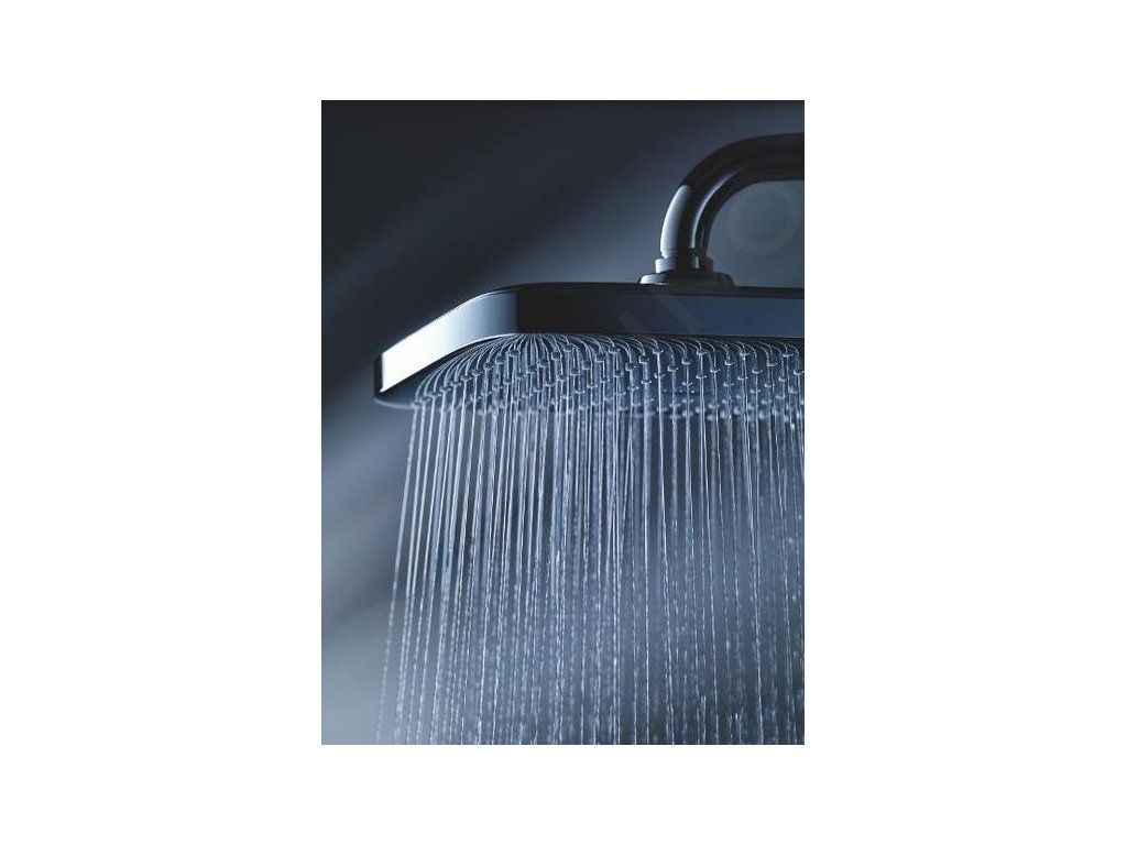 Tato měkká čtvercová sprcha má širokou čelní stěnu o průměru 250 mm, která poskytuje dostatek prostoru pro rozprostření. Je vybavena jemným, osvěžujícím proudem Rain (průtok 8 l/min), který je vylepšen technologií GROHE DreamSpray, jež udržuje stejný a konzistentní proud z každé trysky, což přináší příjemnější zážitek. Funkce úspory vody osloví ty, kteří dbají na udržitelnost - omezovač průtoku GROHE EcoJoy 9,5 l/min šetří vodu i peníze, a přitom stále poskytuje silný a spolehlivý proud. Trysky SpeedClean na sprchové hlavici lze pro snadnou údržbu očistit od vodního kamene prstem. Uvnitř je izolovaný vnitřní vodovodní ventil Inner WaterGuide, který zabraňuje přílišnému zahřívání povrchu a chrání oslnivý, ale odolný chromový povrch GROHE StarLight.