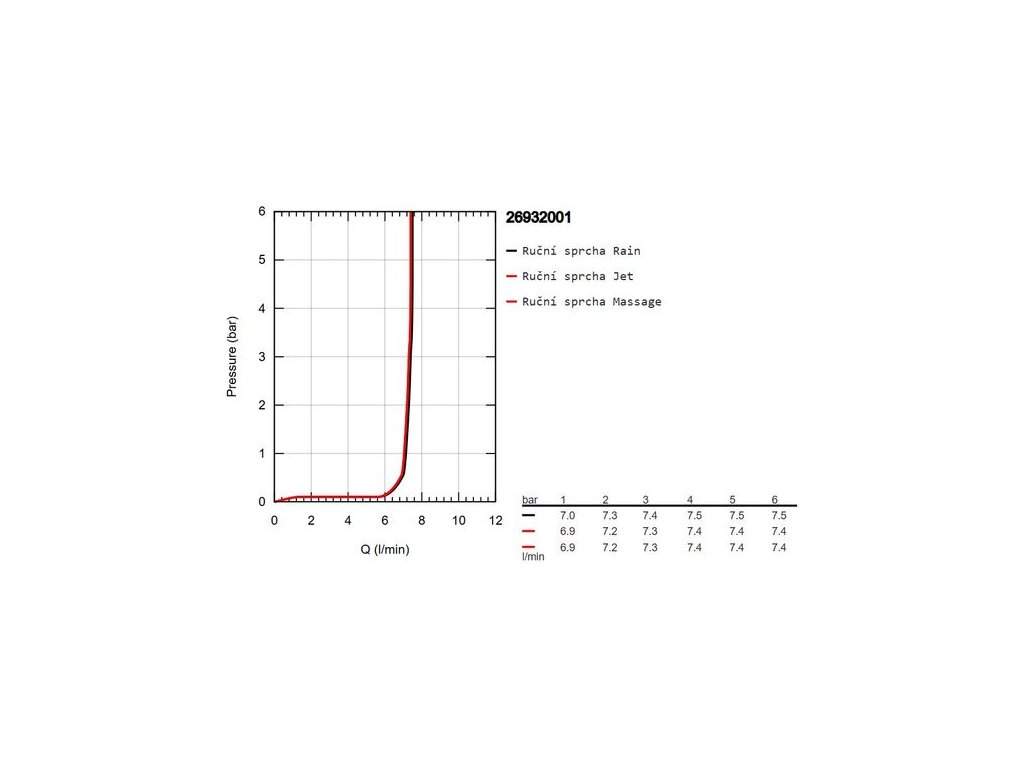 - průtok při 0,3 MPa: Jet: 7,3 l/min, Massage: 7,3 l/min, Rain: 7,4 l/min