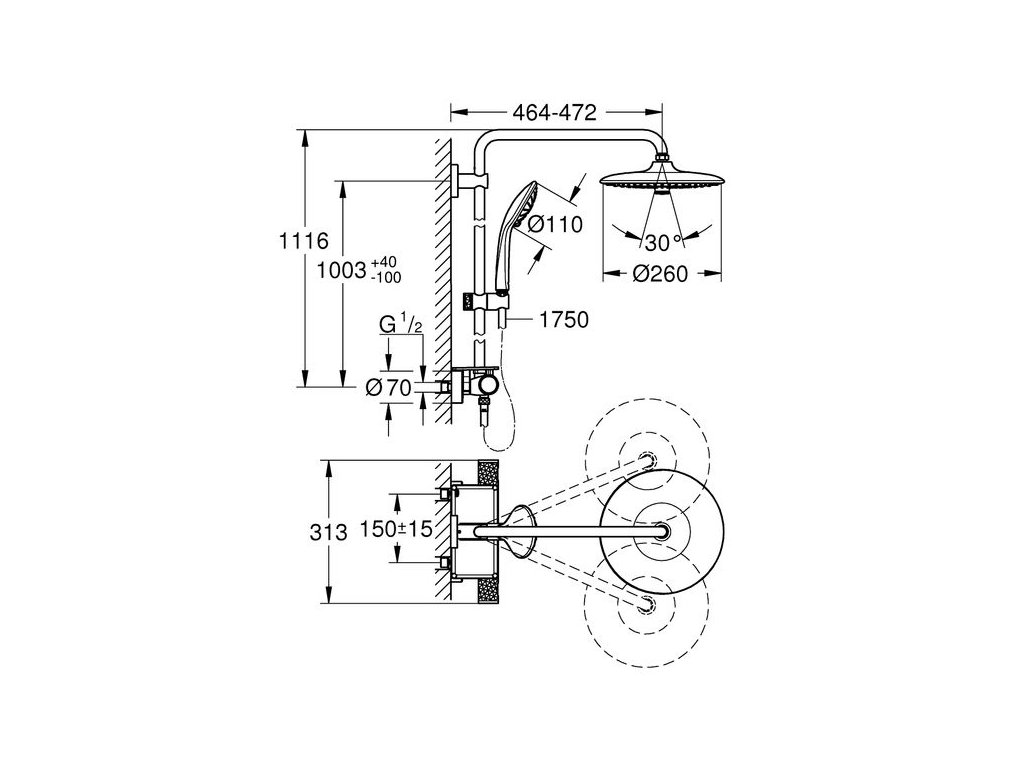 Přepínač AquaDimmer Eco umožňuje přepínat mezi ruční sprchou a hlavovou sprchou – a také regulovat, zapínat a vypínat proud vody. DreamSpray znamená, že proud vody z každé trysky hlavové a ruční sprchy je rovnoměrný. Silikonové trysky SpeedClean se snadno udržují bez nečistot a vodního kamene. Hlavová sprcha Vitalio Joy 260 mm má otočné rameno 450 mm.