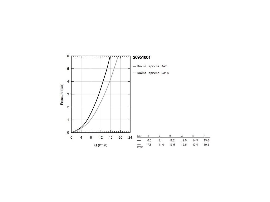 - průtok při 0,3 MPa: Jet: 11,2 l/min, Rain: 13,5 l/min