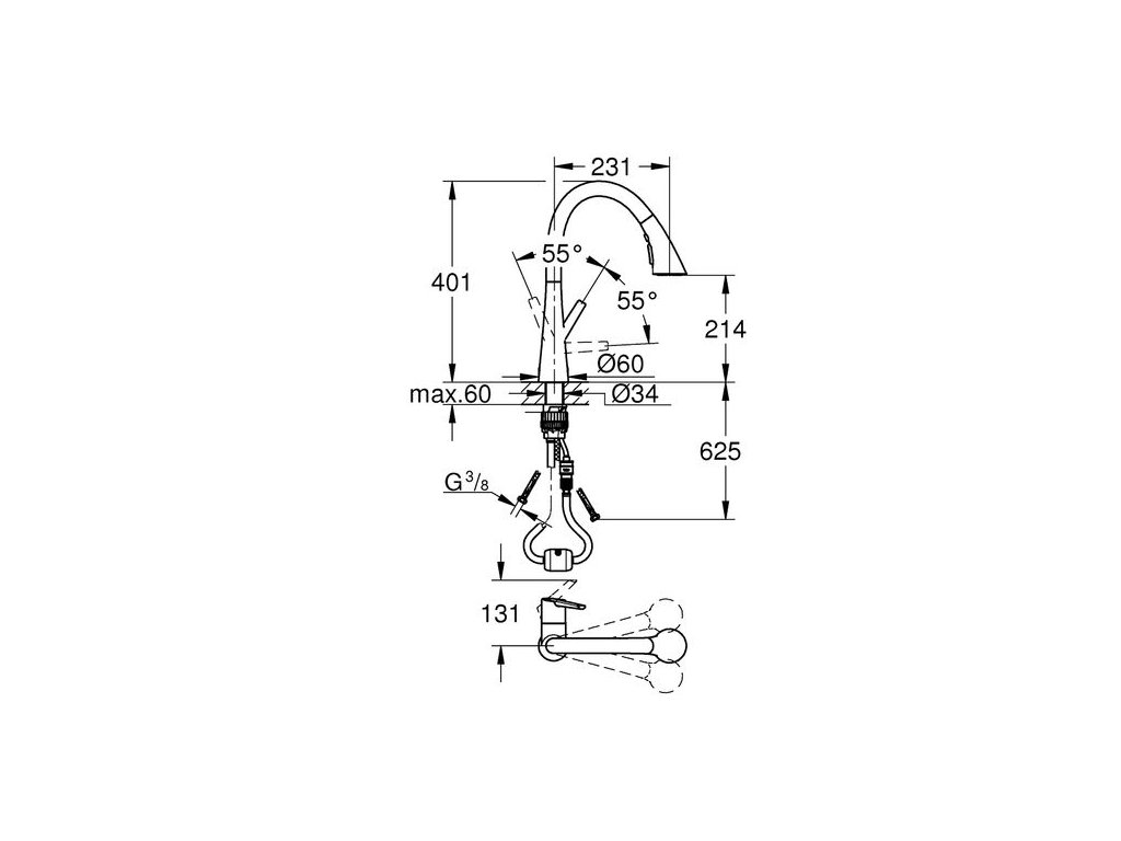 - přepínač: laminární proud / sprchový paprsek SpeedClean / GROHE Blade spray (snížená spotřeba vody až o 70% a ještě vyšší výkon proudu)