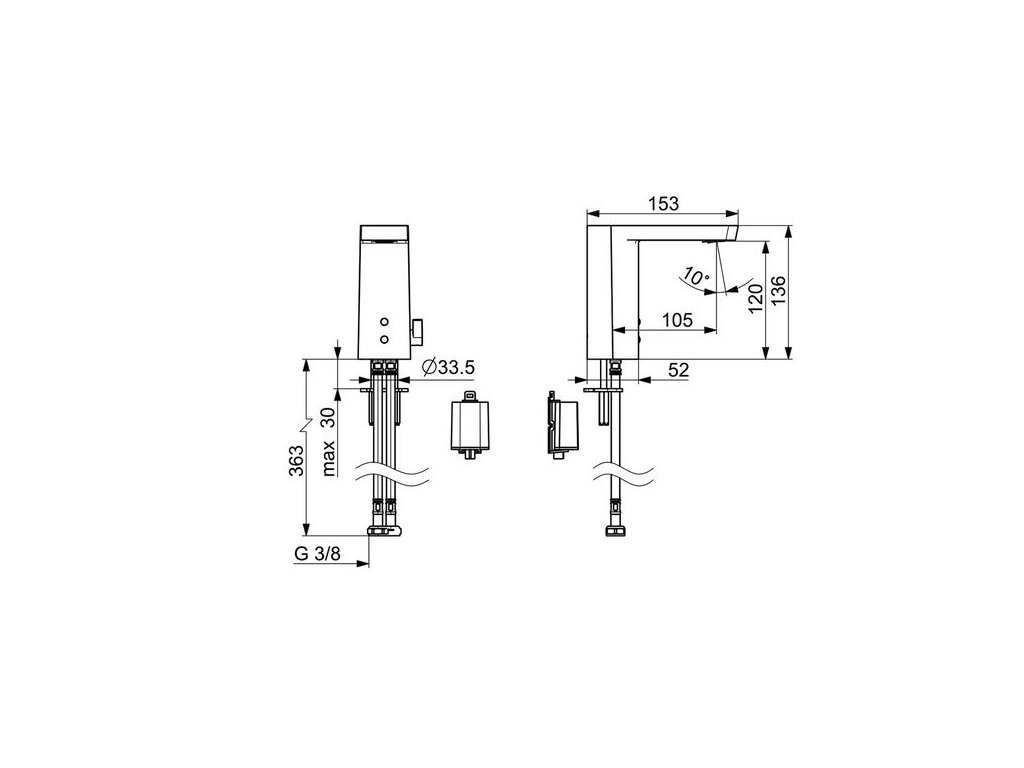 Bezdotyková umyvadlová baterie s regulátorem pro nastavení teploty vody na jejím těle (standardní vybavení). Baterie může být snadno upravena pro předem smíšenou vodu, či regulátor teploty může být uzamčen.