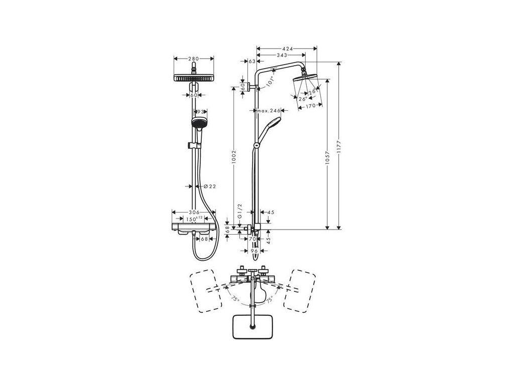 Obsahuje: horní sprcha, ruční sprcha, sprchový termostat, sprchová hadice
