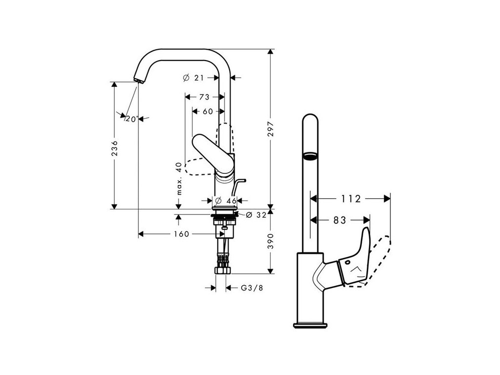 - pozice páky na boku - není vhodné pro umývadlové mísy