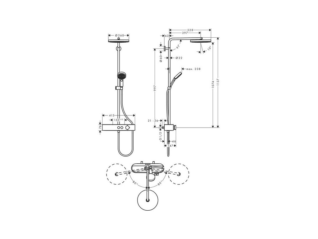 - velikost horní sprchy: 260 mm