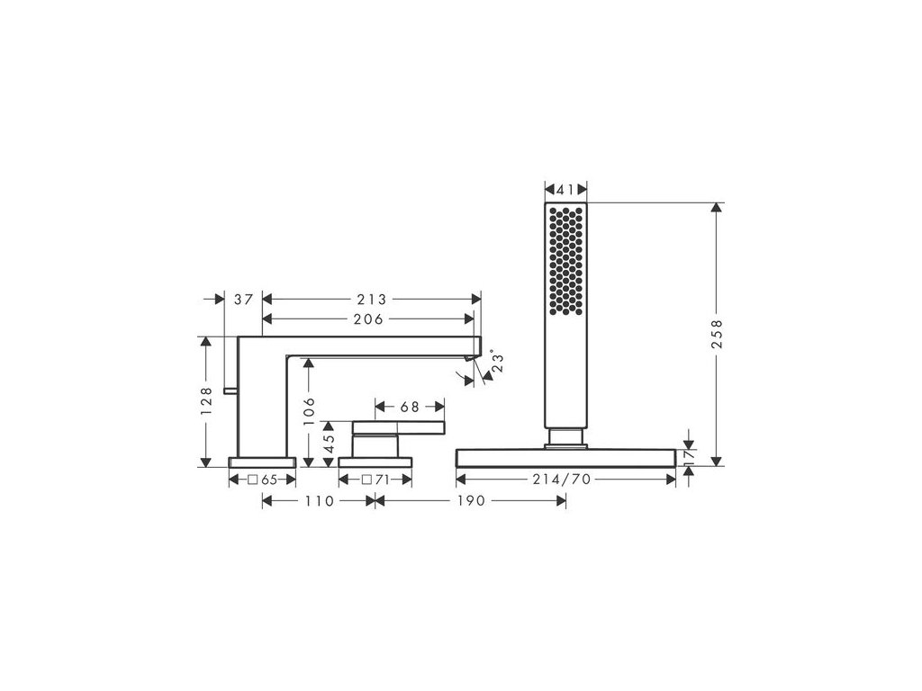 - obsahuje: 3-otvorová páková vanová baterie na okraj vany, ruční sprchy, držák sprchy, sprchová hadice, box na hadici