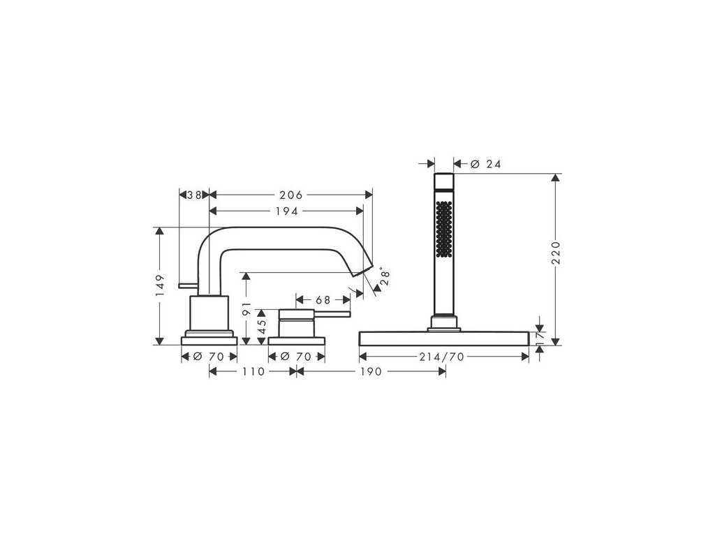 - obsahuje: 3-otvorová páková vanová baterie na okraj vany, ruční sprchy, držák sprchy, sprchová hadice, box na hadici