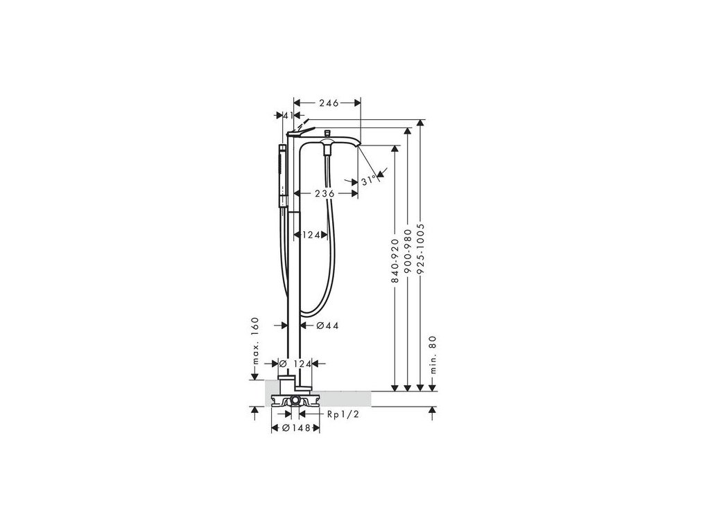 - obsahuje: páková vanová baterie stojící na podlaze, tyčová ruční sprcha, sprchová hadice, sprchový držák