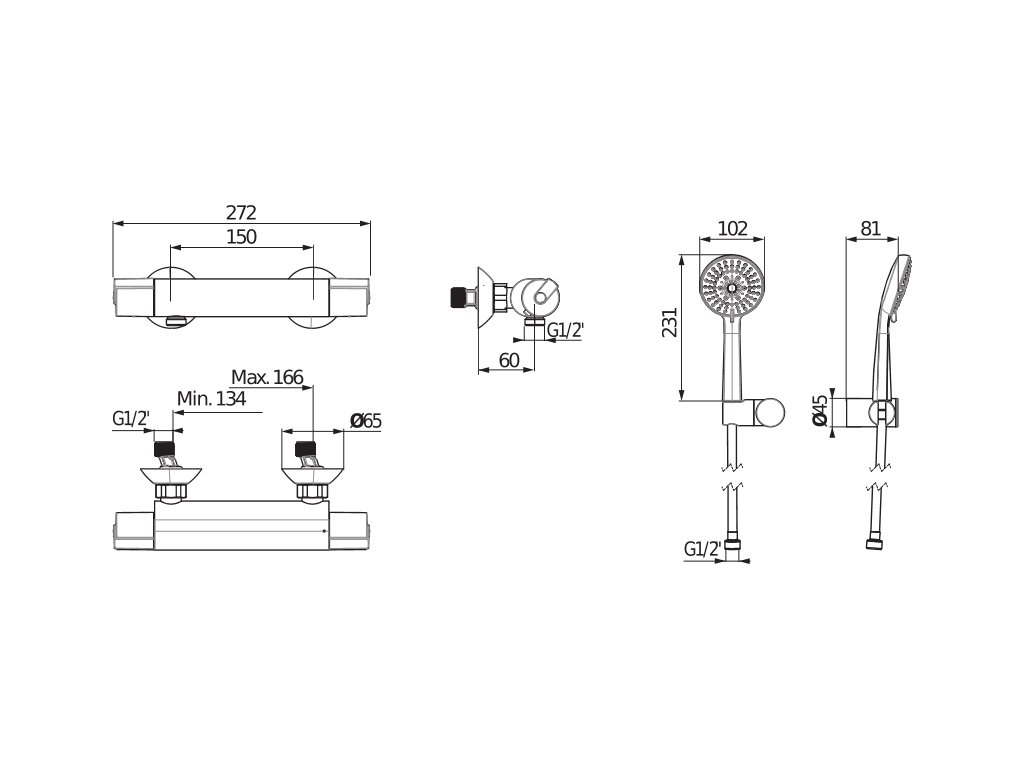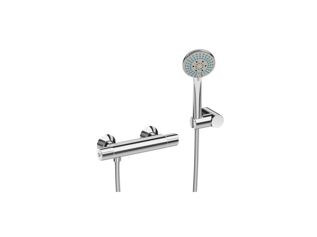 Sprchová nástěnná termostatická baterie s ruční sprchou 100 mm, držákem a sprchovou hadicí