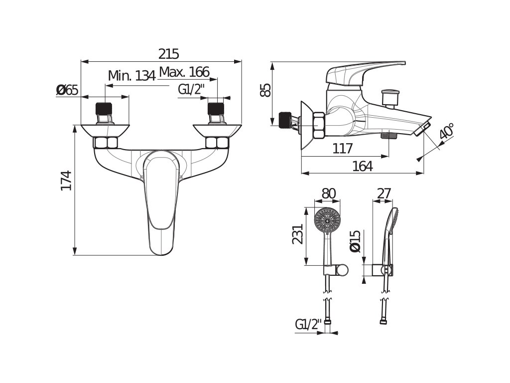 - varianta se sprchovým příslušenstvím (3-funkční ruční sprcha 80 mm, sprchová hadice 170 cm, držák)