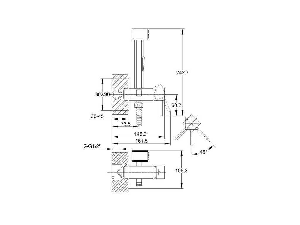 Set sestává z podomítkové bidetové baterie, bidetovou sprškou se STOP-ventilem, hadice v délce 120 cm a držáku sprchy. Vše je umístěno na působivé obdélníkové krycí rozetě. Set tedy nezabírá příliš místa a díky pečlivému uspořádání je opticky velmi příjemný.