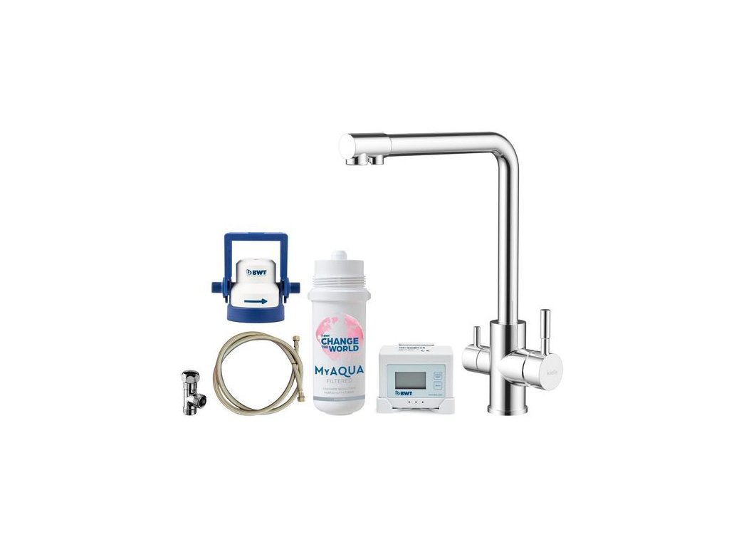 Součástí balení je vedle baterie a filtru také veškeré příslušenství, jež je k plnohodnotné funkčnosti zapotřebí. Montáž je jednootvorová. Získáte připojovací hadice, hadice na připojení filtru, matici pro instalaci baterie, digitální průtokoměr, filtrační hlavici (filtr je kompatibilní s hlavicemi MyAQUA a AQA drink), a T-armaturu. Dokoupit si můžete také testovací sadu, která vám pomůže určit aktuální tvrdost vody ve vaší domácnosti.