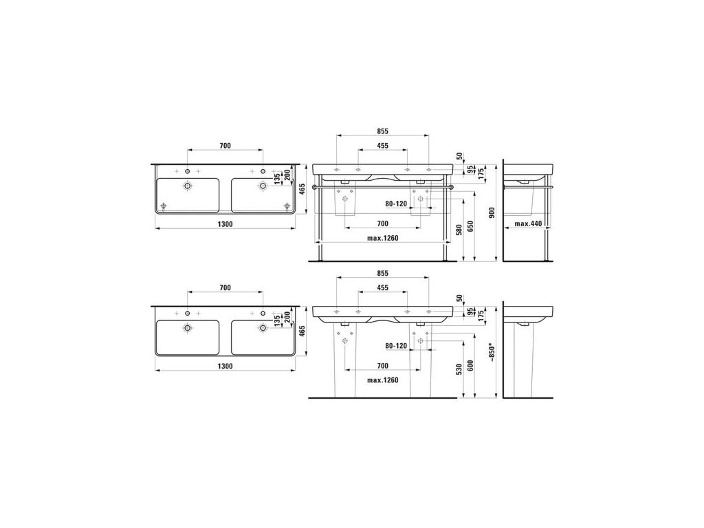 Laufen Pro S Dvojumyvadlo 130 x 46,5 cm se třemi otvory pro baterii, bílá H8149680001081
