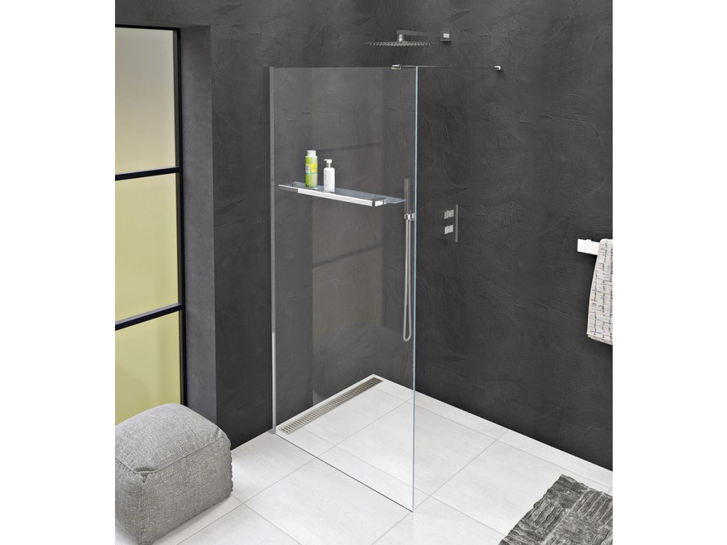 Tento modul není kombinovatelný s žádnou boční stěnou, jedná se o samostatné sklo a stěnový profil s přizpůsobením 25 mm. Sklo se k podlaze zafixuje silikonem.