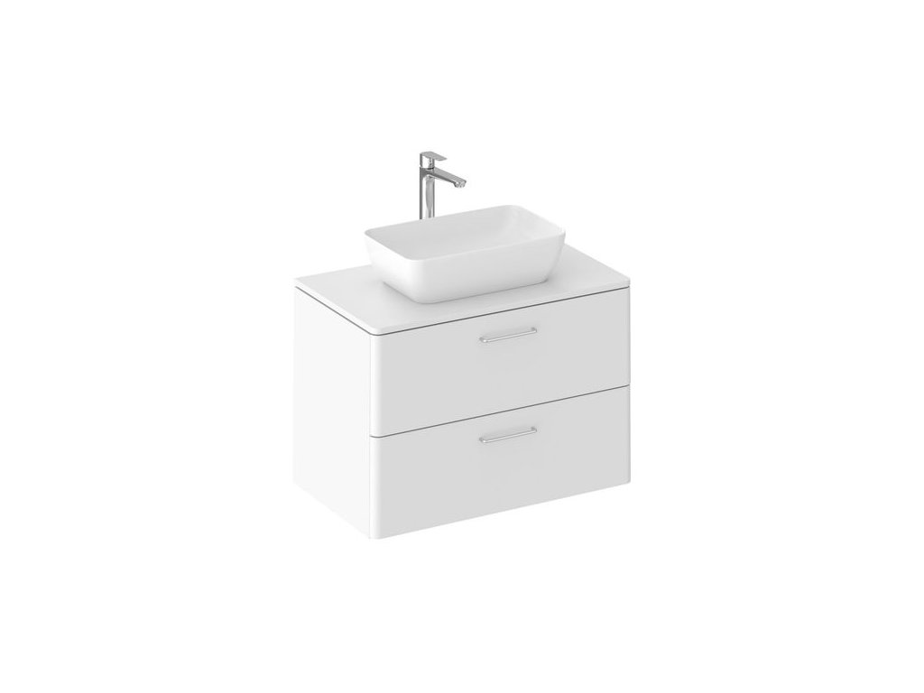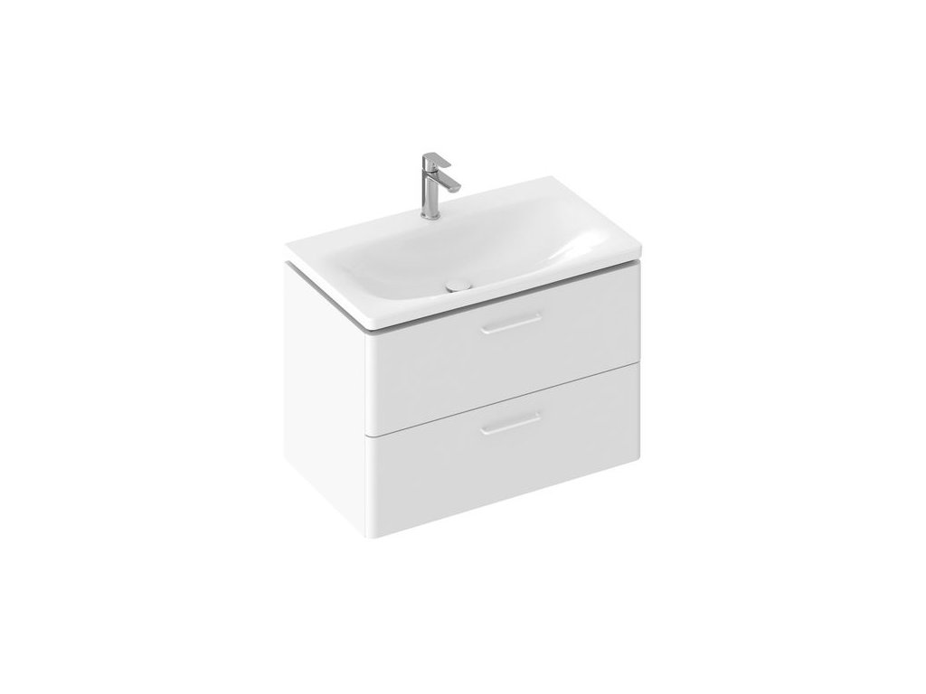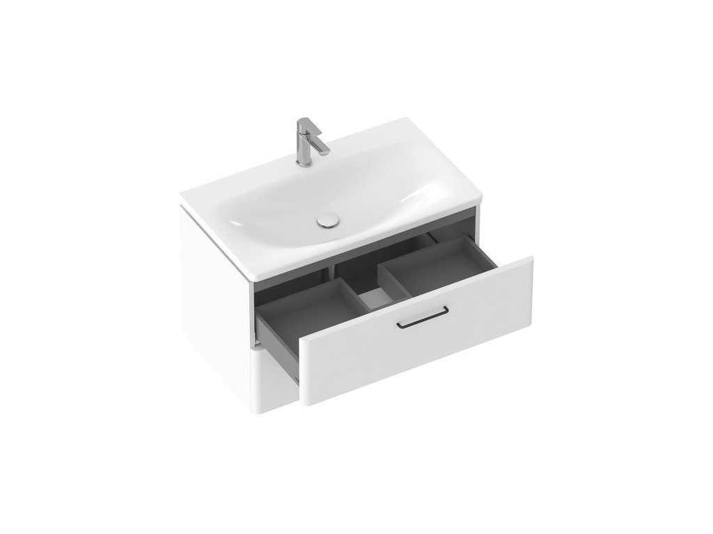 Vnitřní prostor skříňky je v barvě grafit. Dvě praktické zásuvky s pomalým dojezdem nabízí dostatek úložného prostoru. Skříňka má předvrtané otvory pro madla, která nejsou součástí skříňky a je nutné je dokoupit zvlášť ve 2 kusech. Na výběr jsou ve třech barevných provedeních - lesklý chrom, černá nebo bílá. Je určena pod zápustné umyvadlo Balance 80 bez přepadu, doplněné umyvadlovým sifonem s pevnou výpustí. Skříňku lze doplnit také bílou deskou Balance 80 a umyvadlem na desku (např. řady Uni / Uni Slim).