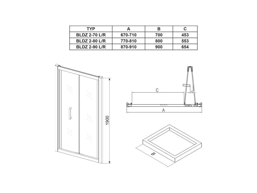 Otočením výrobku o 180° získáte pravou nebo levou variantu vstupu. Montuje se do obloženého rohu koupelny (ideálně do vyzděné niky nebo v kombinaci s pevnou stěnou BLPSZ) na vaničku nebo přímo na podlahu se zabudovaným odtokovým žlabem či podlahovou vpustí. Kombinací se dvěma pevnými stěnami typu BLPSZ vytvoříte sprchový kout ve tvaru „U“.