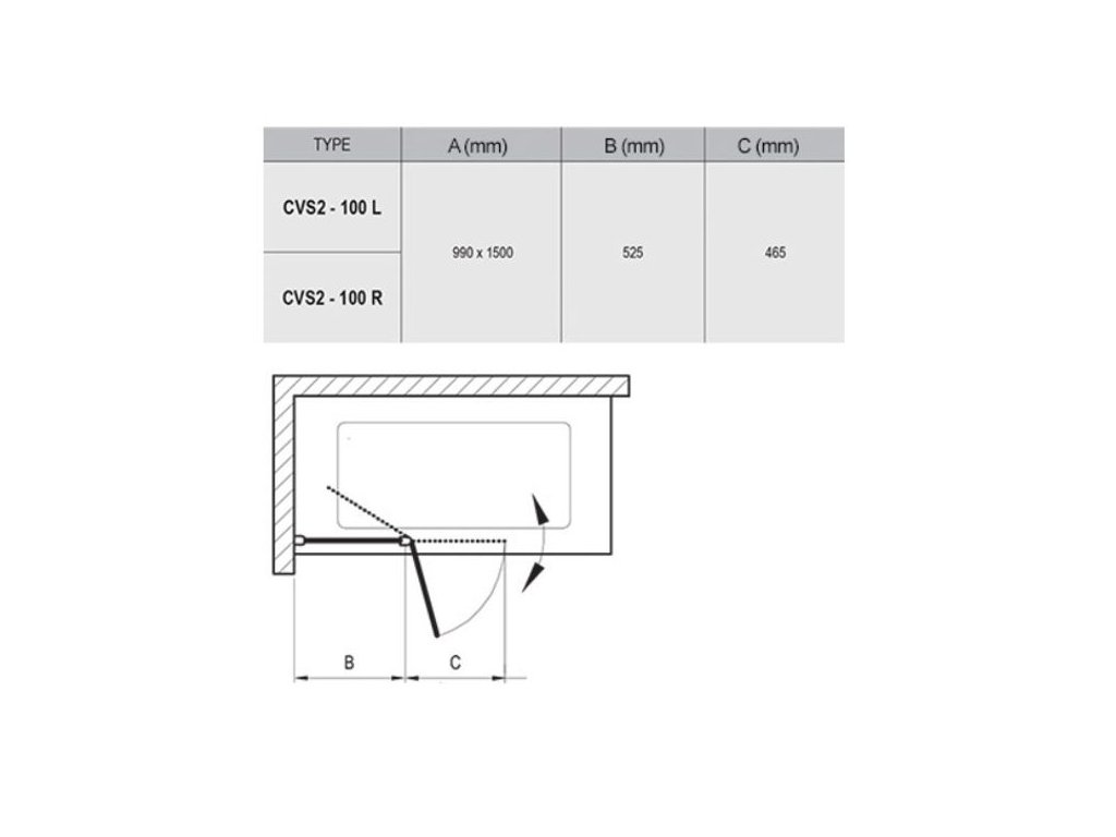 Vanová zástěna je vyrobena z bezpečnostního skla o tloušťce 6 mm. Zástěna se skládá z jednoho pevného a jednoho pohyblivého dílu, který lze vyklopit dovnitř i ven z vany. Pohyblivou část tak lze otevřít v maximálním úhlu až těsně k umyvadlu. Vzpěra pro fixaci skla je součástí balení. Vanovou zástěnu lze instalovat k obdélníkovým vanám s rovným horním lemem. Standardní výška zástěny je 1500 mm.