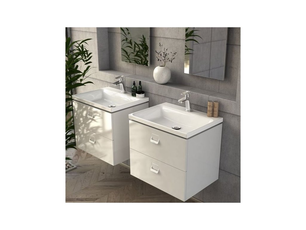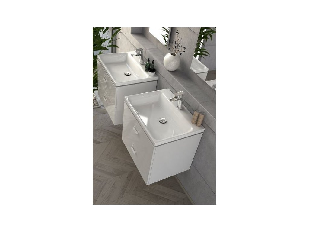 Keramické umyvadlo je znatelně vytvarováno do štíhlých lemů, které celku se skříňkou dodávají odlehčený dojem. Výrazným vykrojením zároveň uvnitř vznikl maximálně velký prostor pro užívání. V místě, kde je to potřeba, však tenký lem přechází do širší odkládací plochy potřebné pro koupelnovou kosmetiku. Umyvadlo Comfort 600 je určeno k zapuštění do závěsné skříňky Comfort 60 cm.