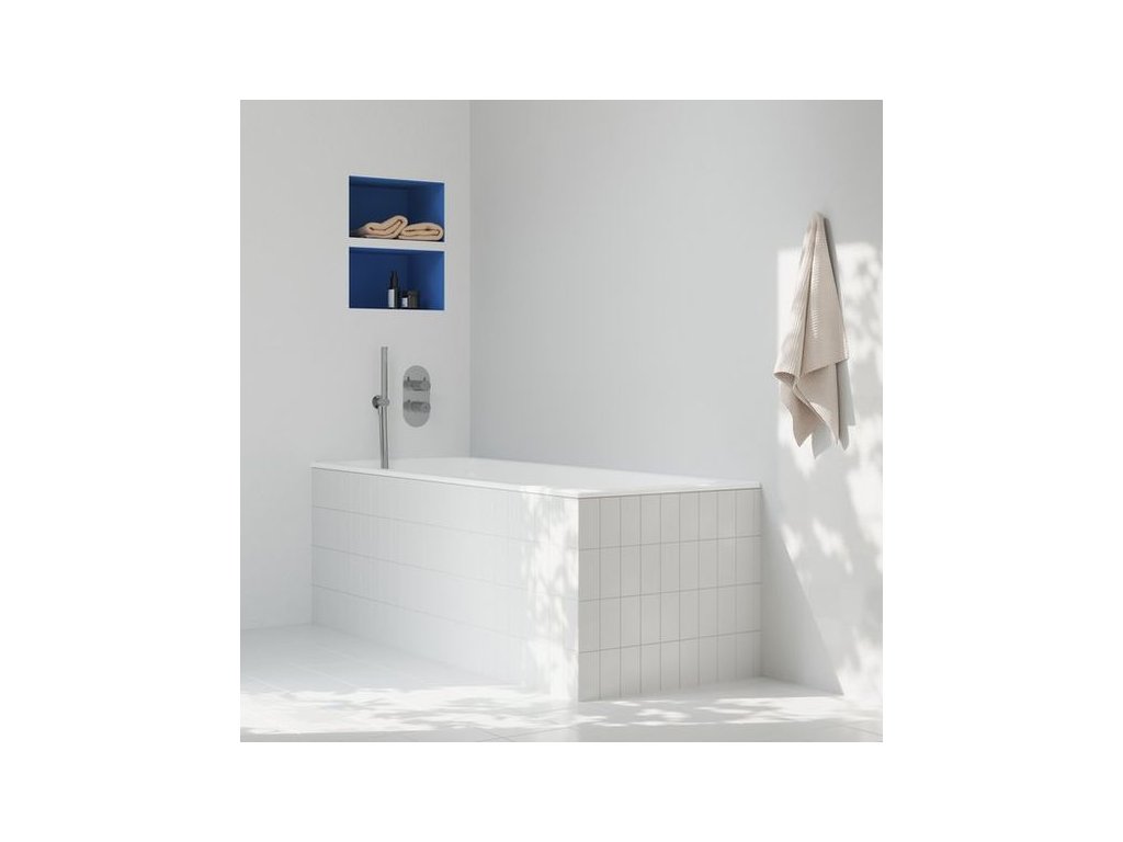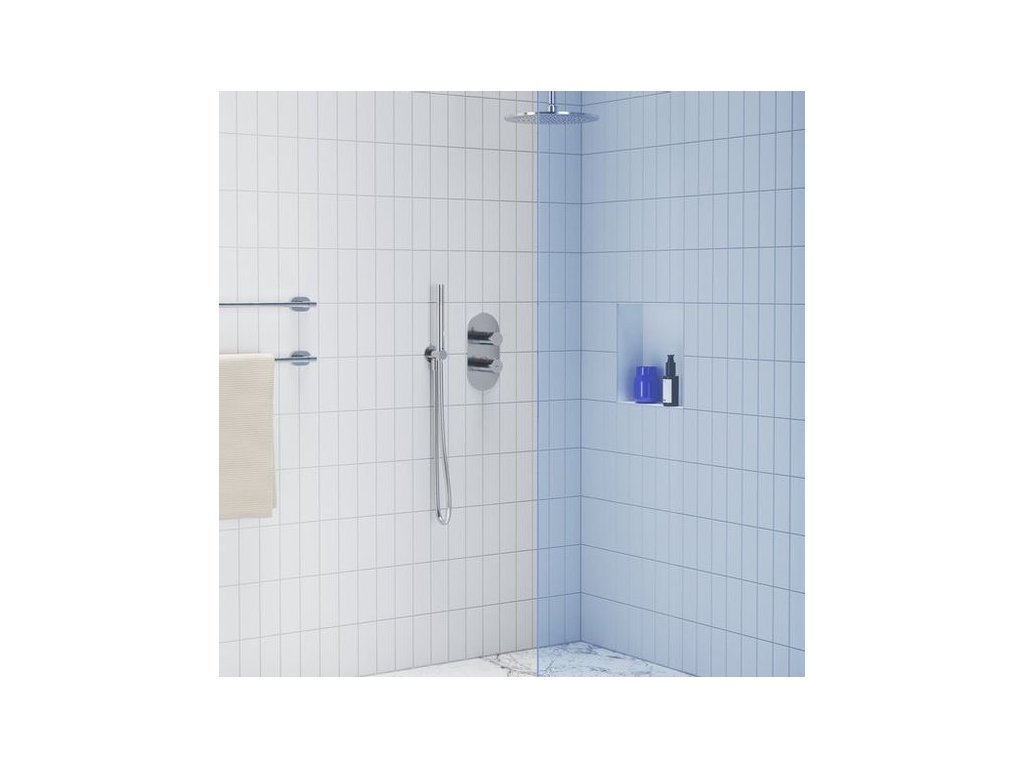 Přirozená krása této podomítkové baterie vychází z pečlivě navržených proporcí každé její části. Subtilní otočná páka reguluje průtok a teplotu vody. Přepínač umožňuje přecházet z napouštění vany ke sprchování, ve sprchovém koutu slouží k přepínání mezi hlavovou a ruční sprchou.