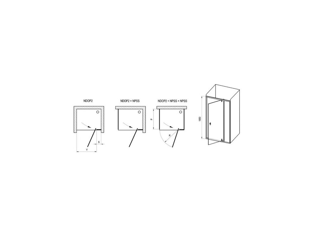 Výrobek se skládá z jednoho rovného pevného dílu a jednoho rovného otočného dílu, který tvoří dveře. Otočením výrobku o 180° získáte levou nebo pravou variantu otevírání dveří. Montuje se do obloženého rohu koupelny (ideálně do vyzděné niky nebo v kombinaci s pevnou stěnou NPSS) na vaničky Ravak Gigant, Gigant Pro, Gigant Pro Flat, Gigant Pro Chrome, Slate Pro, Sandstone Pro nebo přímo na podlahu se zabudovaným odtokovým žlabem či podlahovou vpustí. Kombinací se dvěma pevnými stěnami typu NPSS vytvoříte sprchový kout ve tvaru „U“. Použitím nastavovacího profilu NNPS lze výrobky rozšířit o 20 mm, proto se dokonale přizpůsobí stavebním nerovnostem až o 4 cm na každé straně.