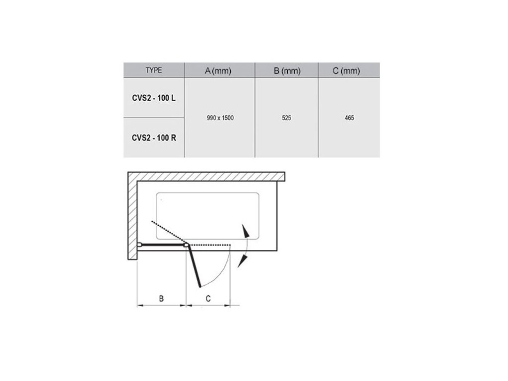 Vanová zástěna je vyrobena z bezpečnostního skla o tloušťce 6 mm. Zástěna se skládá z jednoho pevného a jednoho pohyblivého dílu, který lze vyklopit dovnitř i ven z vany. Pohyblivou část tak lze otevřít v maximálním úhlu až těsně k umyvadlu. Vzpěra pro fixaci skla je součástí balení. Vanovou zástěnu lze instalovat k obdélníkovým vanám s rovným horním lemem. Standardní výška zástěny je 1500 mm.