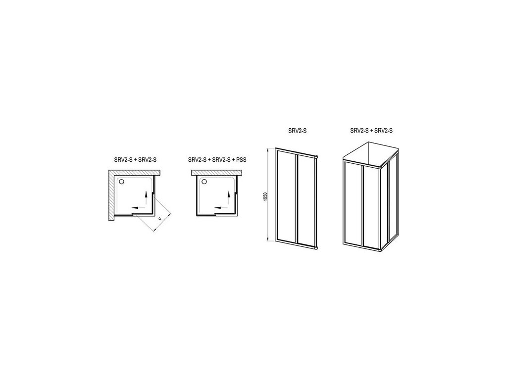 K vytvoření celého koutu jsou zapotřebí dva kusy posuvných dveří SRV2-S. Kombinací různých rozměrů obou dílů získáte čtvercovou nebo obdélníkovou variantu koutu. (např. 75 x 90 cm, 90 x 90 cm, 80 x 100 cm atd.) Sprchový kout je možno přizpůsobit případným nepřesnostem stavebního otvoru pomocí nastavovacích profilů.