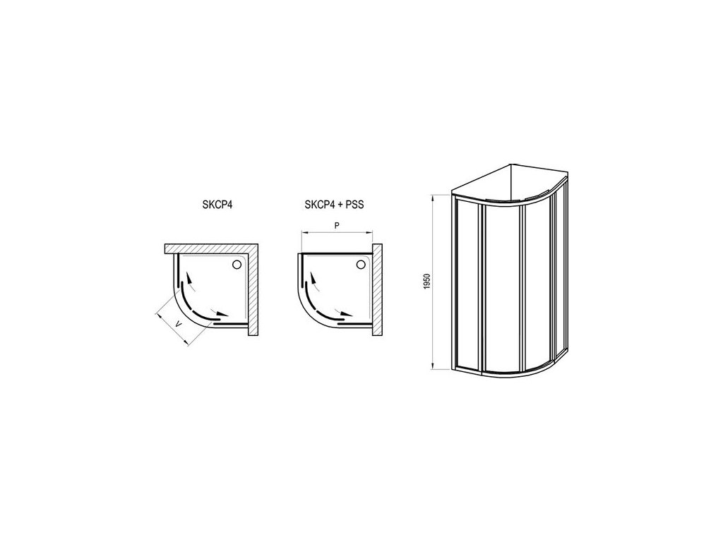 Výrobek tvoří dva pevné rovné díly a dva ohýbané díly jako posuvné dveře.