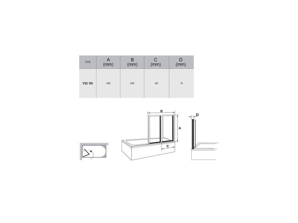 Zástěna se skládá ze dvou pohyblivých dílů, které lze zcela složit do vnitřního prostoru nad vanu. Vanovou zástěnu lze instalovat na obdelníkové vany (City, City Slim, Formy 01, Formy 02, 10°, Chrome, Classic, Classic II, Campanula II, Vanda II) nebo na jakékoli klasické obdélníkové vany s rovným horním lemem. Standardní výška zástěny je 1400 mm. Vanová zástěna VS2 má ve složeném stavu šířku 545 mm. Otočením vanové zástěny VS2 o 180° získáme variantu vstupu zprava či zleva.
